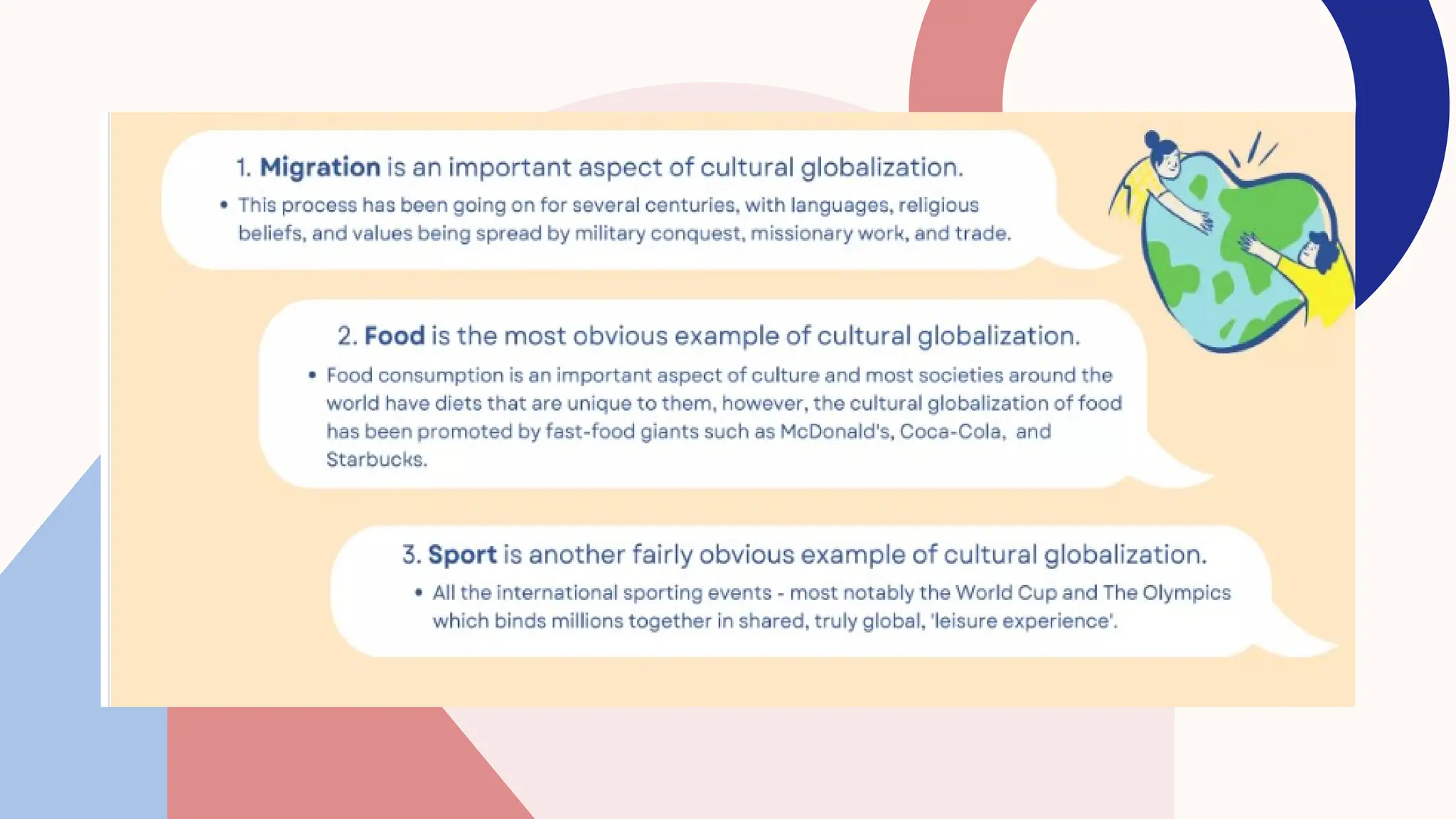 The document discusses globalization as an ongoing process that integrates economic, cultural, and political dimensions between nations and communities. It highlights the role of technological development in facilitating this interconnectedness and outlines three core approaches to globalization: economic, political, and cultural. Additionally, it describes the historical phases of globalization, from archaic to modern, illustrating the evolution of global relations and interactions.