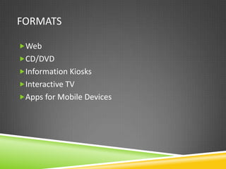This document discusses various formats for delivering interactive content including web, CD/DVD, information kiosks, interactive TV, and apps for mobile devices. Each format has advantages and limitations in terms of accessibility, ability to update content, data restrictions, and screen size considerations that developers must account for.
