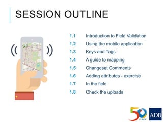This document provides guidance on conducting field validation using mobile applications to collect building and infrastructure attribute data. It outlines the steps including: choosing a mobile app; designing a field validation survey to align with OSM tags and values; practicing adding attributes to buildings and infrastructure in the field; and checking uploaded data. The goal is to efficiently create an exposure database for disaster preparedness and resilience by quantifying vulnerable locations and buildings. Good practices like charging phones, having a mapping plan, and respecting privacy are also covered.