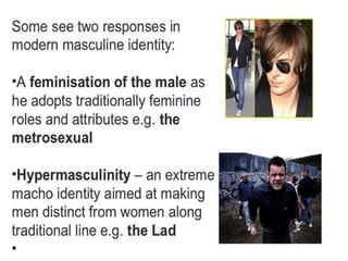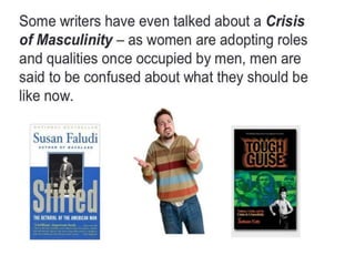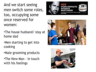 The document discusses gender stereotypes and how they are portrayed in media. It explains that from a young age, children learn stereotypical behaviors for their gender from various sources like family and media. Traditionally, girls are encouraged to play with dolls while boys play with toys like guns or cars. These stereotypes shape distinct gender codes over time. The document then analyzes how older media often portrayed masculinity as superior and showed men in more powerful roles while women were usually depicted as housewives or sex objects. However, more modern representations have challenged these traditions as gender roles became less defined following feminist movements starting in the 1960s.