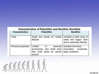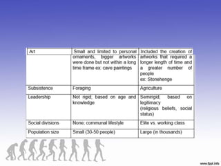 The document discusses human evolution, emphasizing the role of culture as a by-product of survival and biological capacities such as thinking, speaking, and gripping. It traces the development of human culture from the Paleolithic to the Neolithic Revolution, highlighting the shift from foraging to agriculture and the establishment of organized states. Additionally, it describes the significance of museums in preserving cultural heritage and mentions prominent museums worldwide.