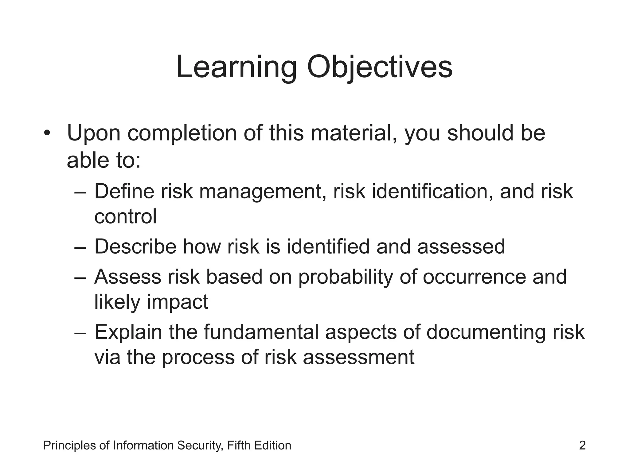 This document discusses the process of risk assessment for information assets. It involves identifying the organization's key information assets, threats against those assets, and vulnerabilities that could be exploited. Assets are prioritized based on their importance to the organization. Threats are also prioritized based on their potential danger and cost. Vulnerabilities of each asset are then identified through brainstorming sessions. A risk assessment evaluates the likelihood and potential impact of each threat to determine an overall risk rating. The results are documented in a risk worksheet to guide further risk management actions.