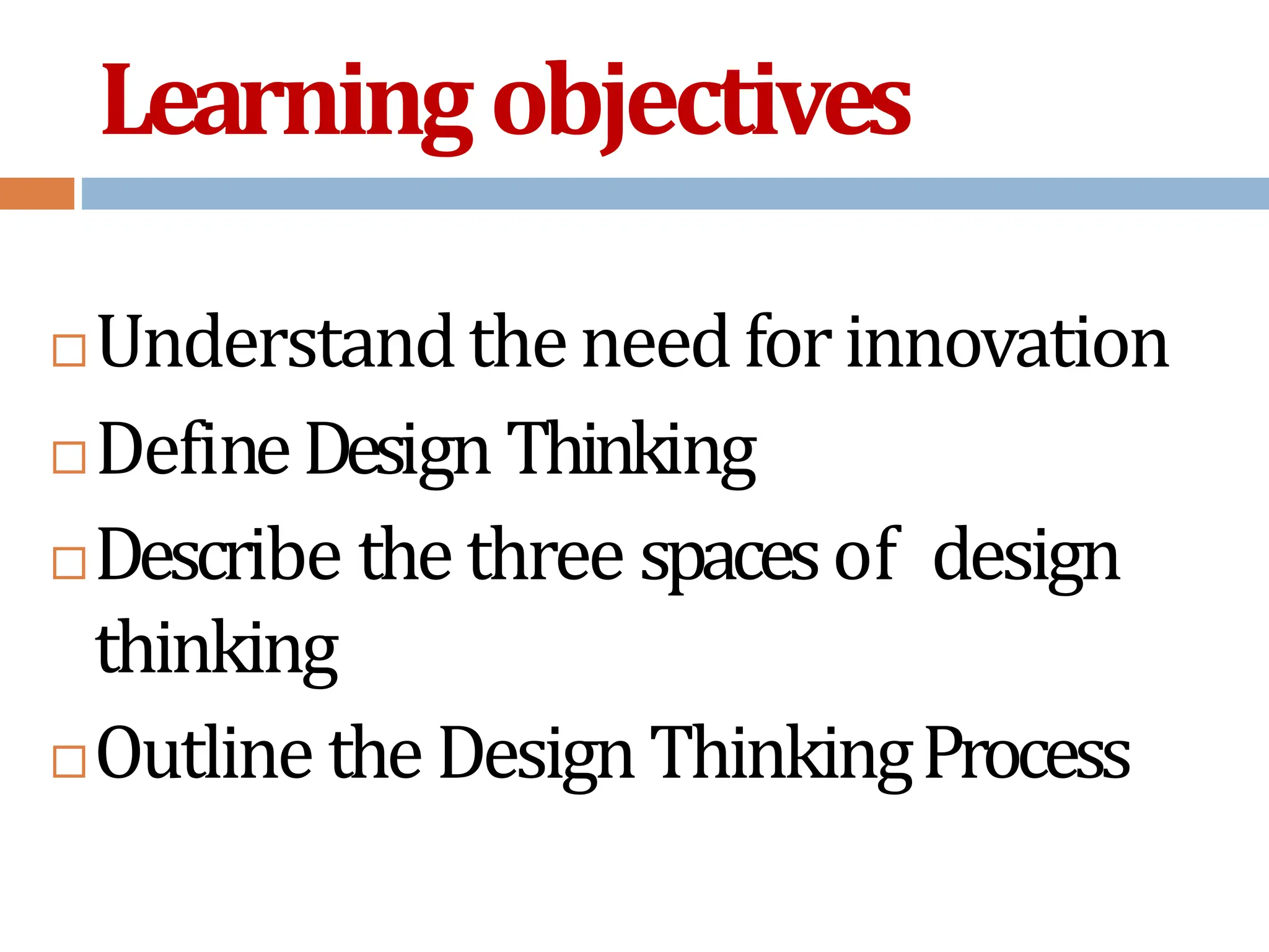 Design thinking is a human-centered approach to innovation that draws from design methods and focuses on empathizing with users, defining problems based on user needs, ideating solutions, prototyping ideas, and getting user feedback to iterate on designs. It involves three key spaces: desirability from the user perspective, feasibility in terms of technical possibilities, and viability regarding business needs. The design thinking process emphasizes empathy with users through observation and engagement to understand user needs, defining problems based on pain points, ideating many solutions through brainstorming, prototyping ideas, and testing prototypes with users to iterate on the design.