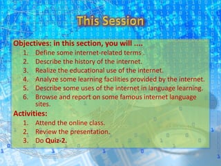 This document outlines objectives for a lesson on the internet. It will define internet terms, describe the history and development of the internet from the 1960s onward. It will analyze educational uses of the internet and how it can be used for language learning. Specifically, it provides opportunities for authentic content, vocabulary practice, communication and language exchange through forums, email and voice chat. Learners can also find learning materials and cultural information online as well as create their own materials to share.