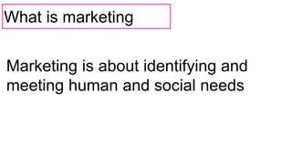 Marketing involves identifying and meeting human and social needs through goods, services, events, experiences, organizations, and more. It analyzes core concepts like needs, wants, and demands - including stated, real, unstated, delight, and secret needs as well as positive, negative, nonexistent, latent, declining, irregular, full, and unwholesome demands. Effective marketing tasks include developing strategies, gaining insights, connecting with customers, building brands, shaping offerings, delivering value, communicating value, and creating long-term growth through people, processes, programs, and performance. There is debate around whether marketing creates new needs or merely satisfies existing ones.
