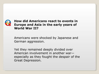 As World War II erupted in Europe, Americans were divided on whether the United States should get involved. While some supported President Franklin Roosevelt's increasing aid to Britain and the Allies through measures like cash-and-carry and lend-lease, isolationists wanted to stay out of the war. Germany rapidly conquered much of Europe, leaving Britain as the sole holdout against the Axis powers. Roosevelt argued that American freedoms were threatened by German and Japanese aggression and increased cooperation with Britain through the Atlantic Charter. However, as Germany attacked American ships supporting the Allies, involvement in the war became inevitable.