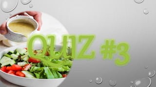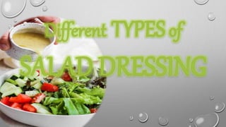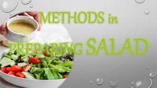 The document discusses how to prepare salads and salad dressings. It outlines objectives related to identifying salad components, selecting equipment, preparing varieties of salads and dressings, and following safety procedures. It provides instructions on washing, chilling, cutting, and marinating salad ingredients. It also explains how to make classic oil and vinegar dressings as well as emulsified dressings like mayonnaise. The key aspects of temporary and permanent emulsions are defined.