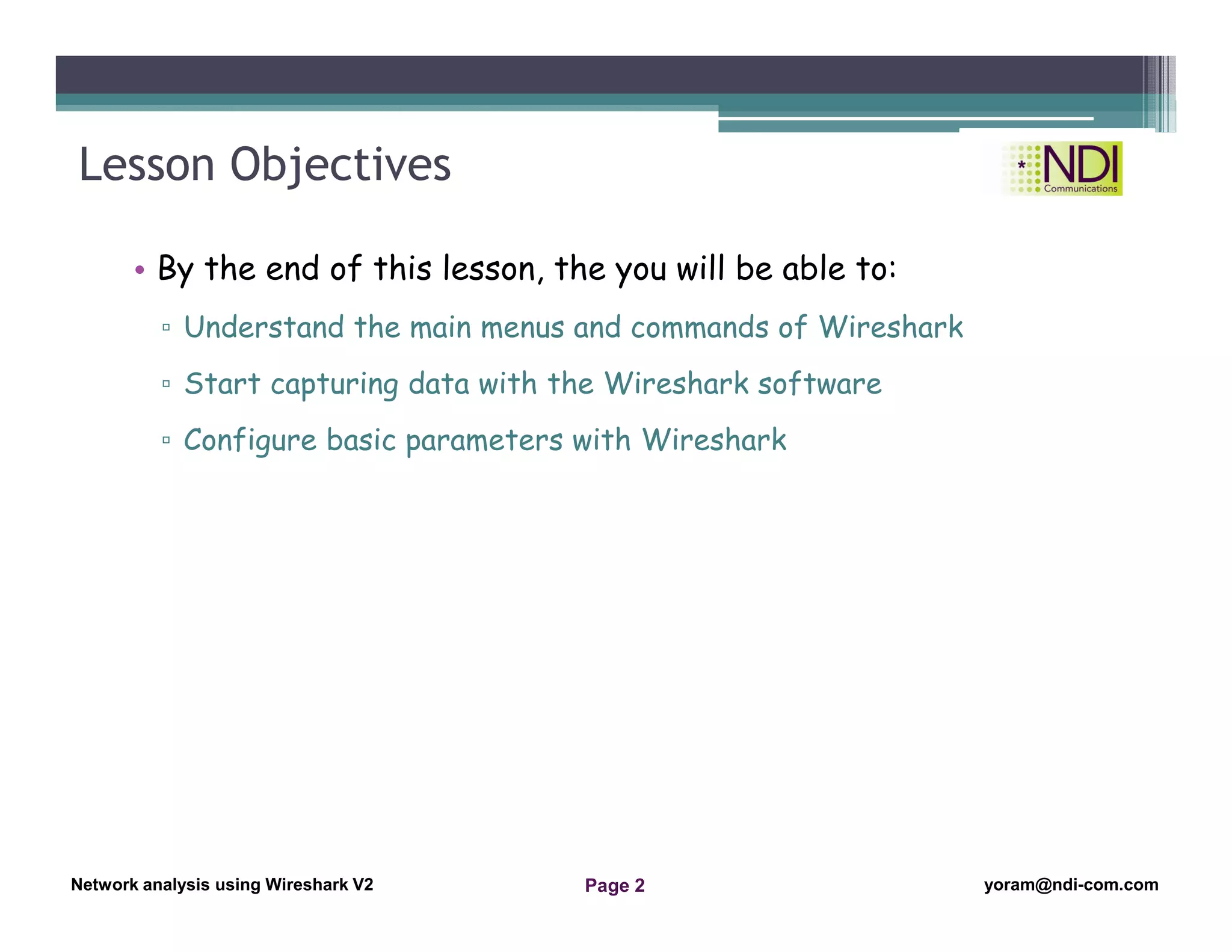 The document serves as a lesson on network analysis using Wireshark version 2, outlining key objectives such as understanding its main menus and capturing data. It covers configuration options, preferences, and navigation techniques, along with a brief history of Wireshark. The lesson concludes with a summary of its origins, menus, and basic configuration tasks.