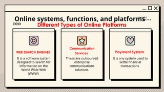 The document outlines various online platforms categorized as social media, communication services, payment systems, and more, explaining their functions and examples. It details how these platforms facilitate interactions, advertising, and community building while emphasizing their diverse roles in modern digital communication. Key platforms mentioned include Facebook, Twitter, Instagram, and various payment services like GCash and PayMaya.