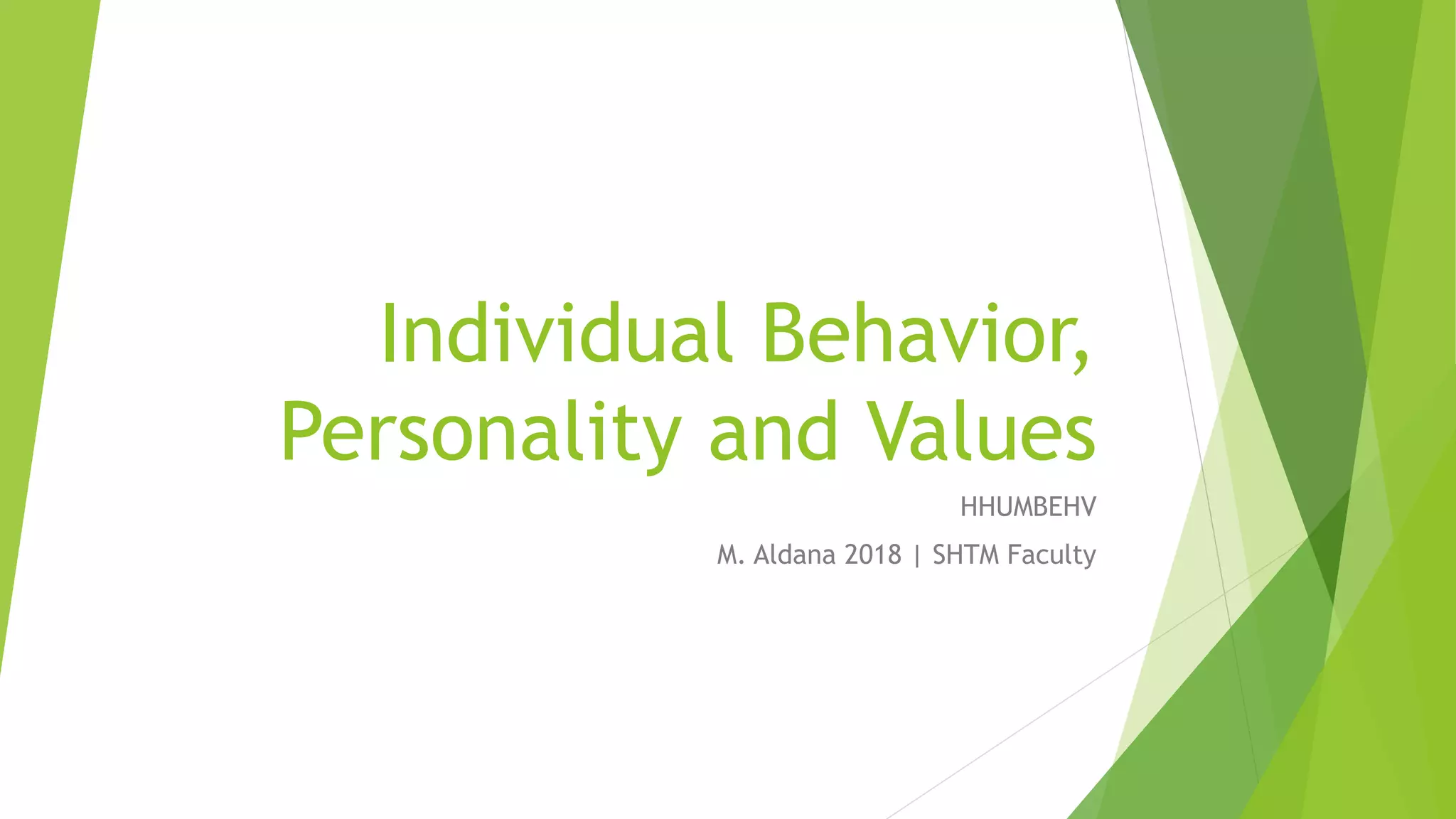 This document discusses values and how they relate to individual behavior and culture. It defines values as stable beliefs that guide preferences and actions. Values are influenced by socialization and form a hierarchy within each person. Personal values can be shared by groups to form organizational or cultural values. Values guide behavior but the link is complex, depending on reasoning and situational factors. The document also describes models of values, including types that fall under openness to change vs conservation and self-enhancement vs self-transcendence. Finally, it discusses how values differ across cultures, such as individualism vs collectivism and uncertainty avoidance.