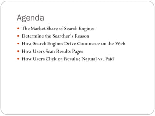 The document discusses the differences between Pay-Per-Click (PPC) advertising and organic search engine optimization (SEO). It emphasizes the dominance of Google in search engine market share and categorizes search intent into navigational, informational, and transactional queries, with a focus on the importance of SEO in driving web commerce. The analysis shows that while PPC spending is currently higher, SEO is presented as a more effective and reliable long-term strategy for businesses.