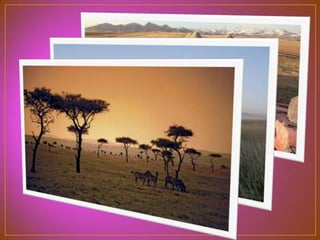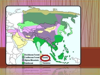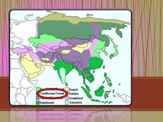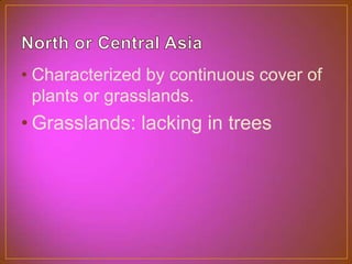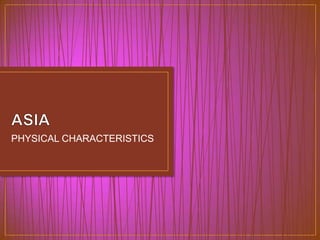 This document summarizes the physical characteristics of Asia. It describes the different types of grasslands, forests, and tundra found in North and Central Asia. It notes key geographical features like Lake Baikal and the Himalayan mountain range. West Asia is characterized by mountains and plateaus with important agricultural areas. South Asia contains the Himalayas and Hindu Kush mountains as well as bodies of water. East Asia includes deserts and plateaus. Southeast Asia experiences monsoon seasons.