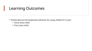 The document outlines physical development milestones for children aged 0-5, focusing on both gross and fine motor skills. It details key milestones for each year of age, highlights the importance of play, and discusses factors influencing development. Additionally, it offers strategies for supporting motor skills in young children and emphasizes the role of the environment in fostering physical development.