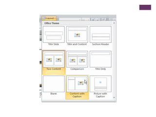 This document provides an overview of basic slide presentation concepts in PowerPoint, including: