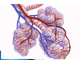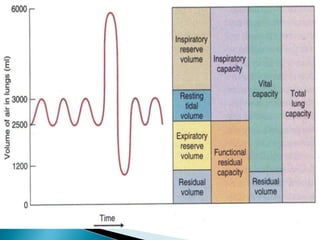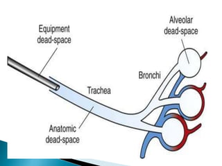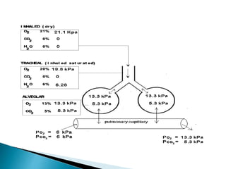 This document defines key terms related to gas exchange and ventilation in the lungs. It discusses functional residual capacity, residual volume, vital capacity, and inspiratory capacity. It defines serial and physiological dead space and how they are measured. It describes how to calculate alveolar ventilation rate given pulmonary ventilation rate, dead space volume, and respiratory rate. It explains the processes of ventilation, perfusion, and the ventilation/perfusion ratio in the lungs.