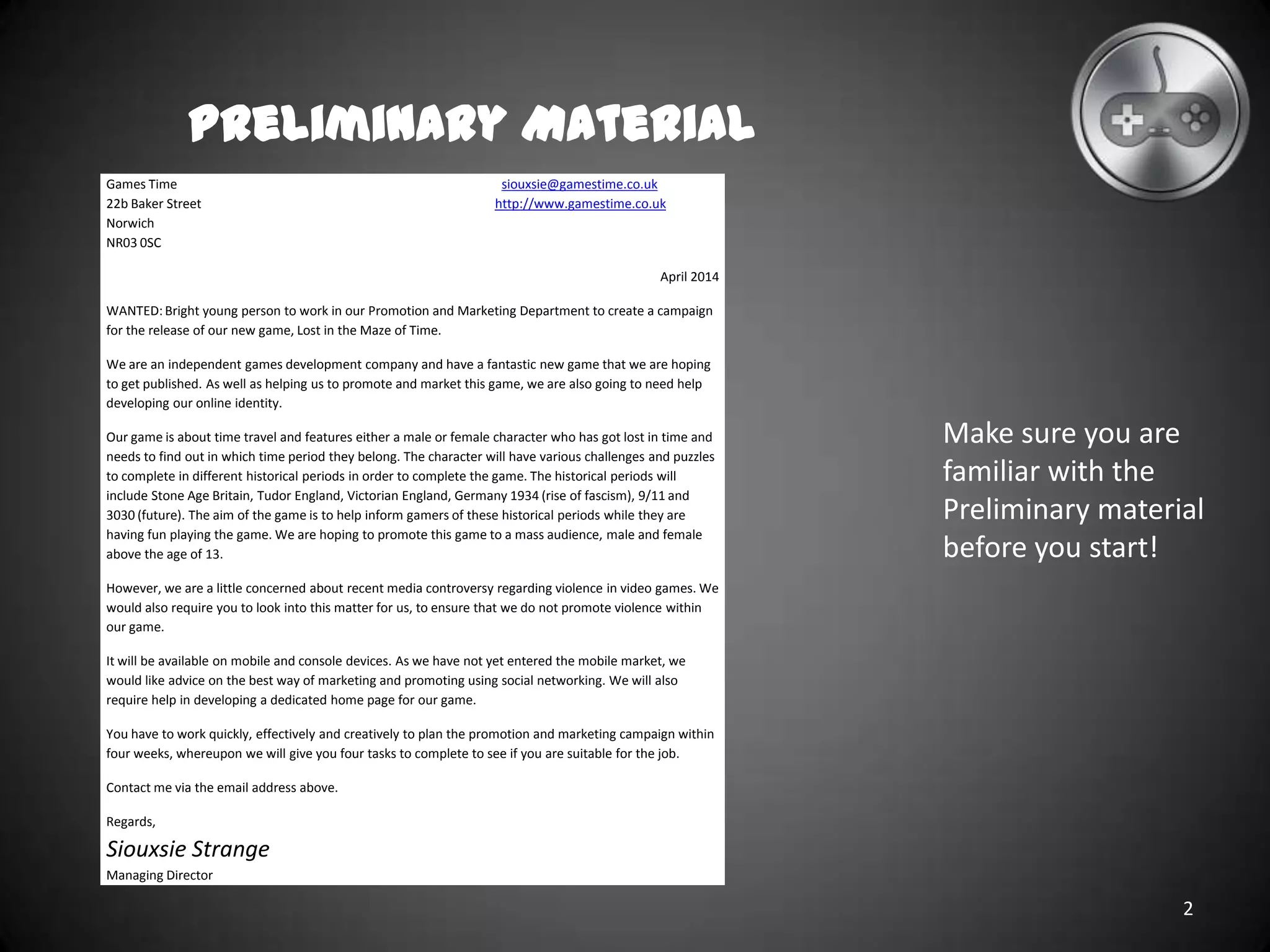 Games Time is an independent video game development company creating a new game called "Lost in the Maze of Time" about time travel between different historical periods. They are seeking a bright person to help promote and market the game within four weeks to test if they are suitable for the job. The game aims to inform players about history while entertaining, but they want advice on ensuring it does not promote violence. As they are new to mobile gaming, the candidate would provide guidance on social media marketing strategies and developing a dedicated website.