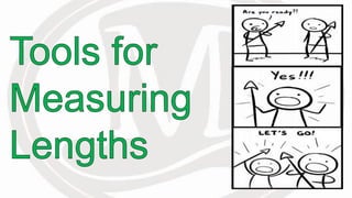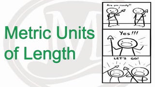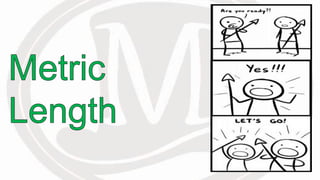 This document discusses measuring length using the metric system. It provides examples of common metric units like millimeters, centimeters, meters, and kilometers. It explains that smaller units are used to measure shorter lengths, while larger units like meters and kilometers are used to measure longer distances. The document also shows how to convert between metric units by moving the decimal point a set number of places to the left or right. Finally, it provides practice problems for converting between different metric units of length.