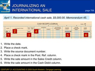 This document discusses recording international sales transactions in accounting. It provides instructions for journalizing an international cash sale, journalizing sales on account using time drafts, and journalizing the collection of cash from a time draft. Key terms related to international sales such as exports, imports, letters of credit, bills of lading, drafts, and trade acceptances are also defined.