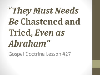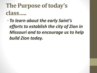 The document summarizes events in early Latter-day Saint history when members settled in Jackson County, Missouri in an attempt to establish the city of Zion. It discusses how the Saints faced persecution from local residents, resulting in their crops and homes being destroyed. Joseph Smith received a revelation, now recorded in Doctrine and Covenants 101, explaining that the Lord allowed these afflictions to come upon the Saints to chasten and purify them. The revelation taught that through enduring hardships with faith, the Saints could gain eternal perspective and redemption would come later.