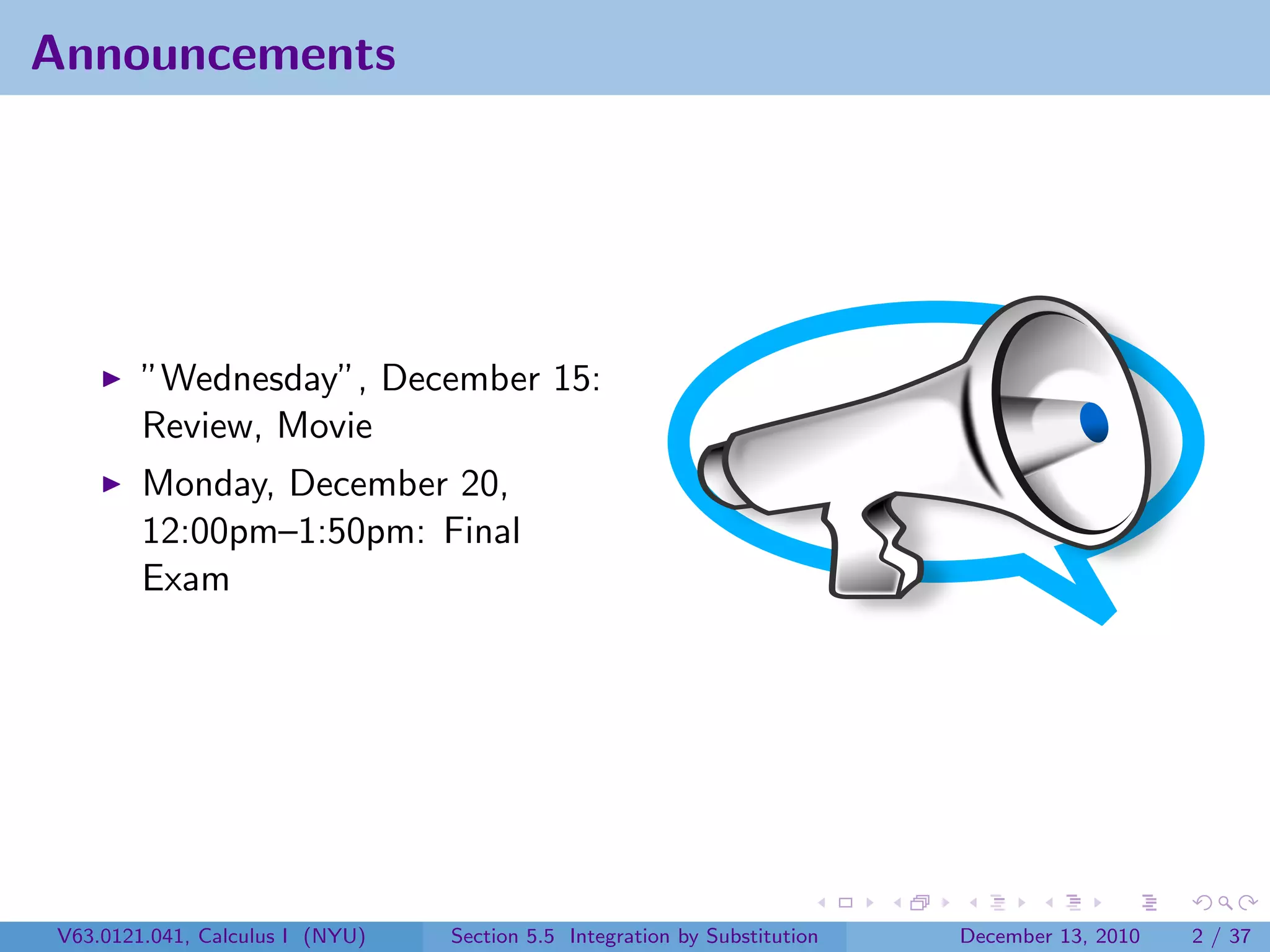The document provides notes from a Calculus I class at New York University on December 13, 2010. It includes announcements about upcoming review sessions and the final exam. It then outlines the objectives and topics to be covered, which is integration by substitution. Examples are provided to demonstrate how to use u-substitution to evaluate indefinite integrals. The key steps are to let u equal an expression involving x, find du in terms of dx, and then substitute into the integral.