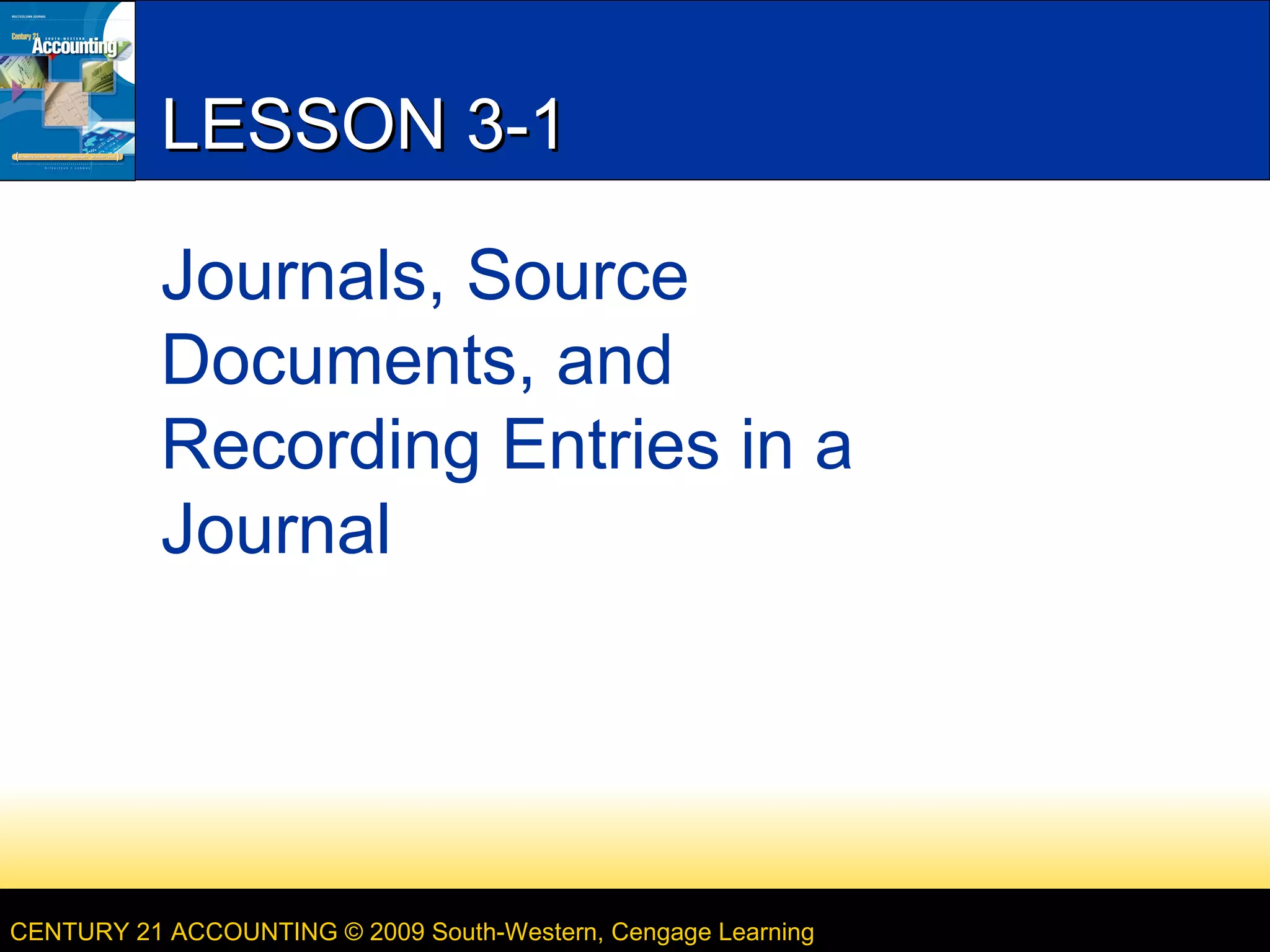 This document discusses journals, source documents, and recording entries in a journal in accounting. It describes a five-column journal and common source documents like checks, sales invoices, receipts, and memorandums. It provides an example of recording the receipt of cash from the owner as an investment in the journal, with details on filling out each column. It also demonstrates recording the payment of cash for supplies in the journal. Finally, it lists key terms discussed in the lesson like journal, journalizing, entry, source document, check, and invoice.