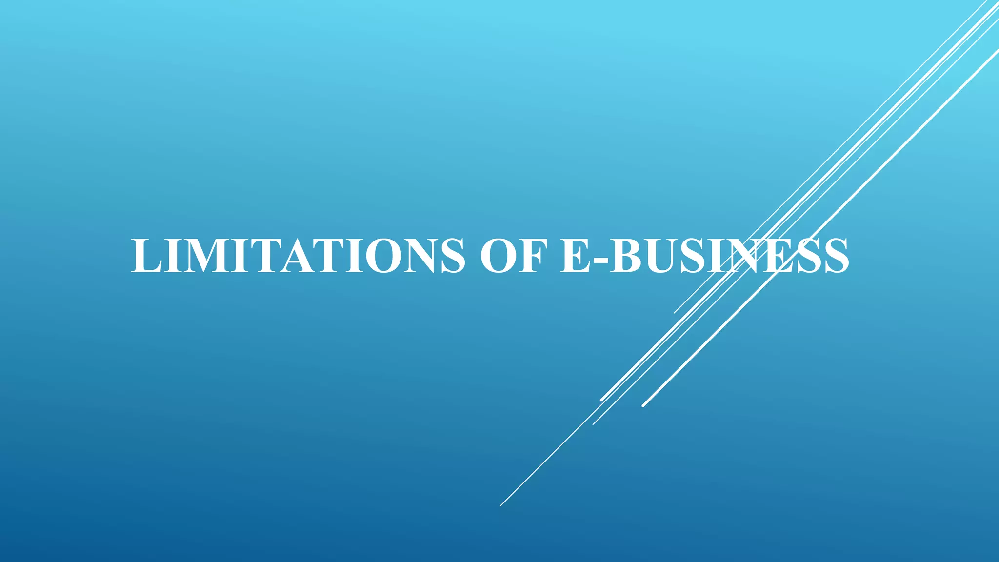 E-business has several limitations, including a lack of personal touch between buyers and sellers which is important for business success. Delivery through e-business may be delayed, disturbing customers. Both parties need technological capabilities and competence or e-business will be difficult. It can also be hard to establish the identities of parties to internet transactions or keep an eye on transactions and privacy. People also tend to resist new technologies due to feelings of insecurity.