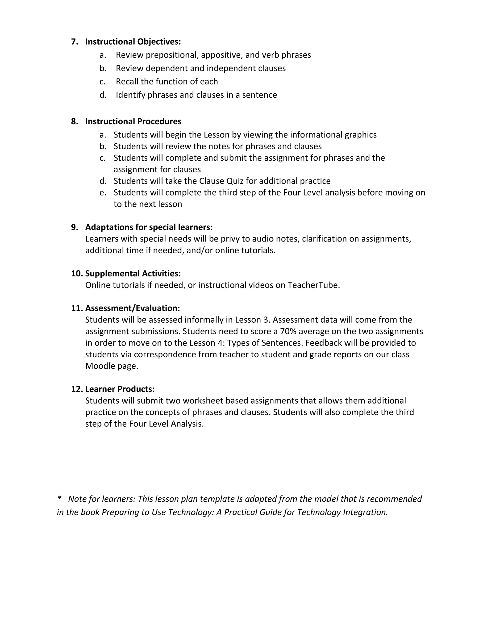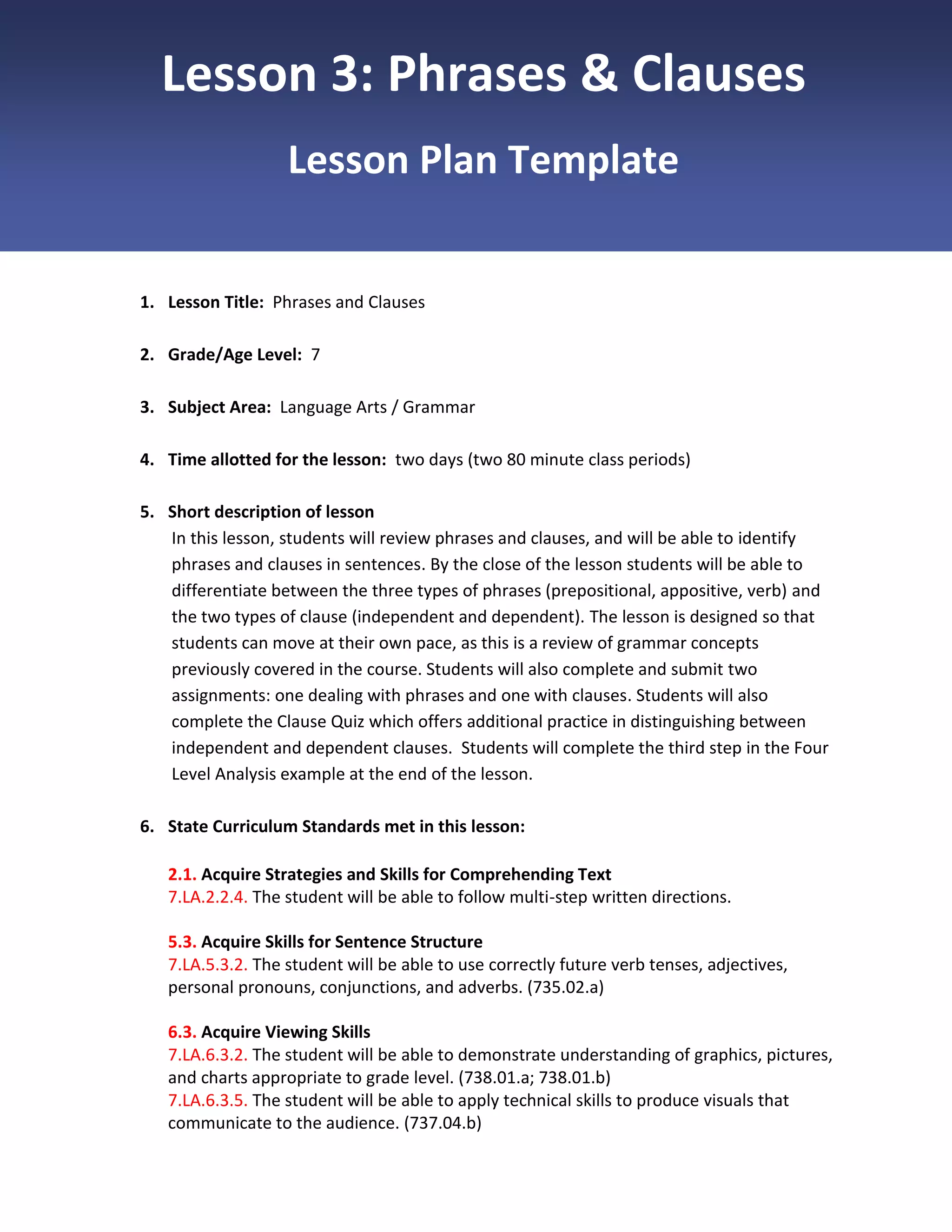 This two-day lesson plan for 7th grade language arts teaches students about phrases and clauses. Students will review prepositional, appositive, and verb phrases, as well as independent and dependent clauses. They will identify phrases and clauses in sentences. The lesson is self-paced, and includes assignments on phrases and clauses, as well as a quiz for additional practice distinguishing clauses. Students must score 70% on the assignments to move to the next lesson on sentence types. Adaptations and supplemental activities are provided for special learners.