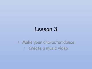 This lesson teaches students how to make a character dance in a video by changing the background to a stage, making the character dance to music, and saving the project file to a USB drive so it can be worked on elsewhere. Students are instructed to choose a character, make it dance to music on a stage background, and save the file by navigating to their USB drive to export their creative project.