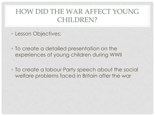 The document discusses how World War 2 affected young children in Britain. It provides lesson objectives on creating presentations about the experiences of children during the war, including their schooling, health, fears, evacuation, happiness, and problems. Key points to be covered are how many children were evacuated, who they went to stay with, and including a diary account from a child who was evacuated. Additional sources provide data on who was most evacuated in 1939, as well as discussing the long term impacts of evacuation such as exposing poor living conditions and increasing calls for government action on social issues like poverty, education and public health.