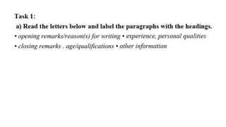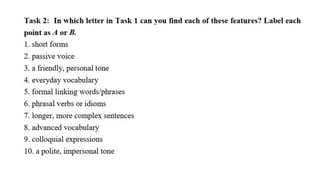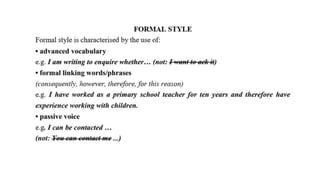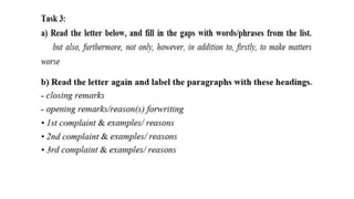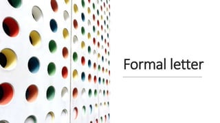 This document provides information about the format of a formal letter and includes an example formal letter. It discusses the typical parts of a formal letter which include an opening, body, and closing. The example letter is responding to questions asked in a previous letter. It addresses three complaints or questions, providing reasons and examples for each one. In closing, it offers further assistance and expresses looking forward to future correspondence.
