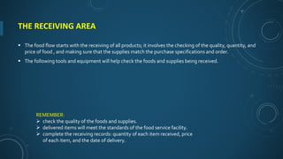 The document summarizes kitchen tools and equipment used in different areas of food flow - receiving, storage, preparation, cooking, and holding. In the receiving area, scales, thermometers, and dollies are used to check supplies. The storage area utilizes refrigerators, freezers, shelves, and containers. Preparation equipment includes slicers, grinders, mixers, processors, and can openers. Cooking is done using ranges, ovens, grills, and specialized equipment. Holding keeps food warm using steam tables, bain-maries, and cabinets. Cleaning practices are also outlined for various tools and areas.