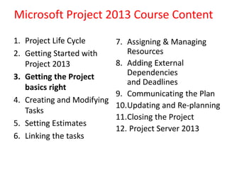 The document provides guidance on setting up a Microsoft Project plan correctly by getting the basics right. It discusses assigning the project calendar, defining working times and exceptions, setting project properties and options, and saving the project locally, to the cloud, or a Project Server. Setting up the project correctly at the start includes tasks like configuring the calendar, dates, and saving location to facilitate effective project planning and management.