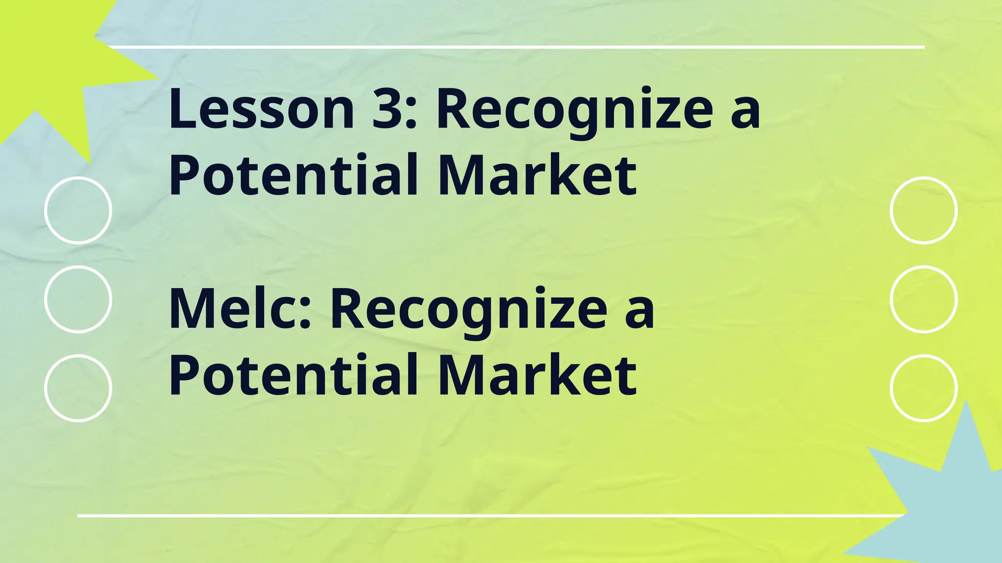 The document outlines a lesson on recognizing potential markets and seeking entrepreneurial opportunities. It covers identifying market needs, proposing solutions, and understanding the role of an entrepreneur in addressing these needs through creativity and awareness of external factors. Key elements include the sources of opportunities such as changes in the environment, technological advancements, government policies, people's interests, and past experiences in the industry.