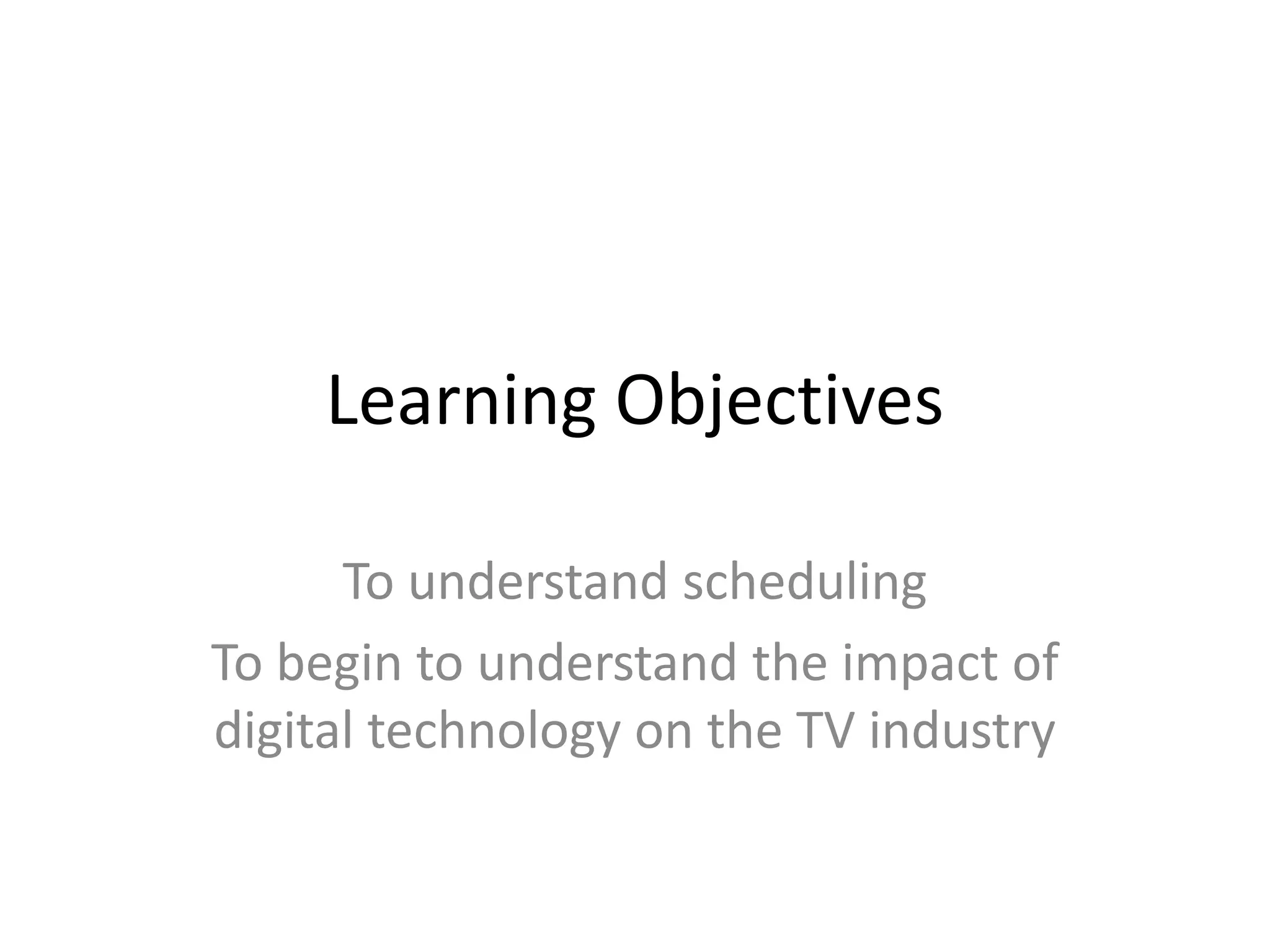 The document discusses how digital technologies have impacted the TV industry. It explains how viewers can now watch TV programs whenever and wherever they want through on-demand services like Sky+, DVDs, the internet, and mobile devices. This has led to increased programming options but smaller and more fragmented audiences. While most TV viewing has splintered across various platforms, some event TV programming is still able to attract large live audiences. Social media also plays a role in generating buzz around certain shows.