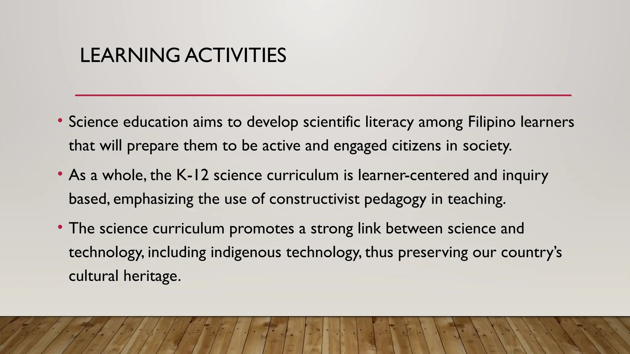 The document outlines the K-12 elementary science curriculum in the Philippines, which focuses on developing scientific literacy among learners. It emphasizes a learner-centered, inquiry-based approach and promotes the integration of science and technology to preserve cultural heritage. The curriculum aims to equip students with scientific knowledge, skills, attitudes, and values to address local and global issues effectively.