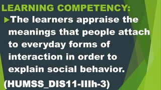 This document discusses the sociological theory of symbolic interactionism. It defines symbolic interactionism as a framework that focuses on the meanings individuals attach to objects, people, and interactions. These meanings arise from social interactions and are modified through interpretive processes. The document outlines three central ideas of symbolic interactionism: 1) people act based on the meanings of things, 2) meanings come from social interactions, and 3) meanings can change. It also discusses key thinkers in symbolic interactionism such as Blumer, Cooley, and Mead, and concepts like the looking glass self and stages of self development.