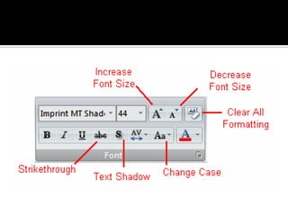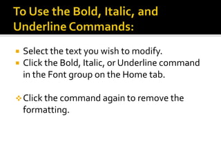 This document provides instructions for performing basic text formatting and manipulation tasks in PowerPoint, including inserting, deleting, selecting, moving, and formatting text. It describes how to insert and format text in text boxes and placeholders, use font styling options like bold and italics, change font size and color, align text, move text via copy/paste or drag-and-drop, and insert and manipulate text boxes. The document concludes with a challenge asking the reader to practice these skills on a sample presentation.