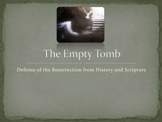 The document discusses the historical and scriptural evidence supporting the resurrection of Jesus Christ, addressing common roadblocks and objections to its validity. It emphasizes the reliability of New Testament accounts, early creeds, and multiple attestations as critical for proving the resurrection's historicity. The author argues that the resurrection hypothesis is more plausible than alternative explanations and highlights the significant consensus among scholars regarding the empty tomb and subsequent witness testimonies.