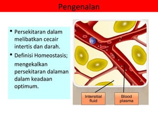 Dokumen ini membincangkan konsep homeostasis manusia, menekankan peranan ginjal dalam mengekalkan persekitaran dalaman yang optimum melalui proses penyingkiran urea, pengawalan isipadu air, tekanan osmosis, dan pH darah. Struktur nefron di dalam ginjal berfungsi dalam pembentukan urin melalui ultraturasan, penyerapan semula, dan rembesan bahan buangan. Mekanisme suap balik negatif juga diterangkan sebagai cara untuk memulihkan sistem kepada keadaan asal setelah perubahan berlaku.