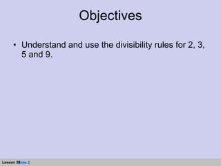 The document discusses divisibility rules for determining if a number is divisible by 2, 3, 5, or 9. It provides explanations and examples of applying the rules. The rules are: