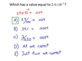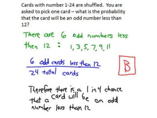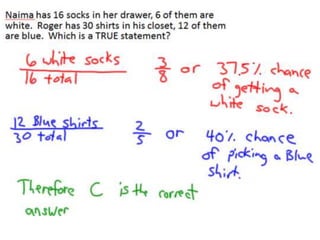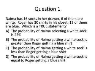 This math lesson contains 4 probability questions. Question 1 asks about the probability of selecting a white sock from a drawer of 16 socks where 6 are white compared to the probability of selecting a blue shirt from a closet of 30 shirts where 12 are blue. Question 2 asks which option has a value equal to 2.4 x 10^-2. Question 3 asks about the probability of selecting an odd number card less than 12 from a shuffled deck of cards numbered 1-24. Question 4 asks which statement best describes a graph.