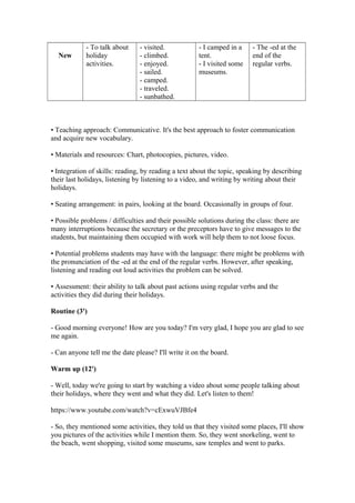 This document outlines a lesson plan for a class focusing on holiday activities using the simple past tense. The lesson includes reading a text about classmates' holidays, completing sentences about holiday activities, writing a letter describing a past holiday with missing verbs, and students sharing about their favorite past vacations. The goals are for students to develop their reading, writing, listening and speaking skills related to describing past holiday experiences and activities using regular past tense verbs.