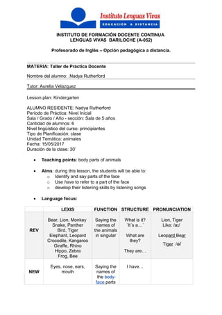 The lesson plan is for a kindergarten class teaching animal body parts in English. The 30 minute lesson includes watching videos and singing songs to introduce vocabulary like eyes, nose, ears and mouth. Students do a puzzle activity to identify body parts of a lion. They also color animal masks and sing wearing the masks. The teacher will email parents with details of the lesson and videos.