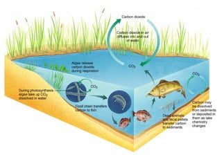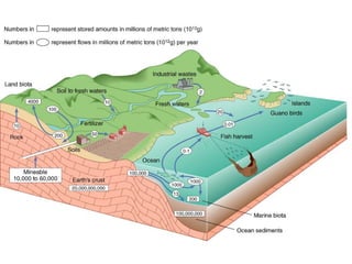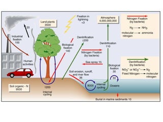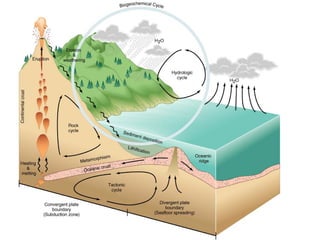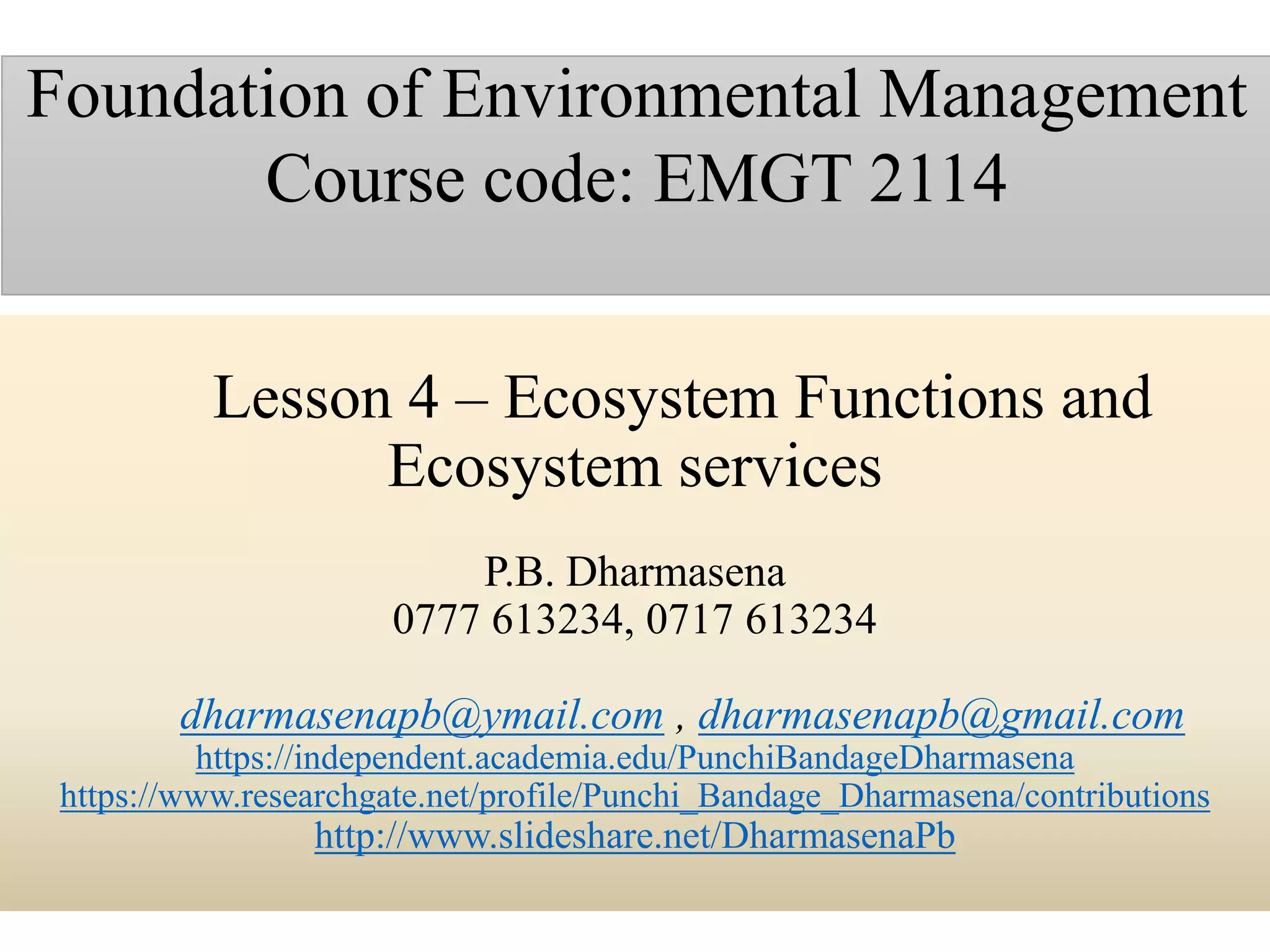 The document discusses ecosystem functions and services, emphasizing the intricate relationships within ecosystems and the importance of various biogeochemical cycles such as carbon, nitrogen, and phosphorus. It highlights how ecosystems provide critical services that sustain human life, such as nutrient cycling, water purification, and climate regulation, and identifies four main systems: lithosphere, hydrosphere, atmosphere, and biosphere. Different approaches are presented for classifying and valuing ecosystem services, emphasizing their role in human well-being and the impact of human activities on these natural systems.