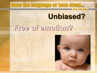 This document provides guidance on evaluating information sources. It introduces several models for evaluating sources, including the CRAAP test and the relevance/credibility model. The CRAAP test examines the currency, relevance, authority, accuracy, and purpose of a source. Additional factors discussed for evaluating sources include the author's qualifications, whether the information has been peer reviewed, potential biases, and accuracy. Students are encouraged to consider these criteria when evaluating both online and print sources for a research task or assignment. The document stresses the importance of carefully evaluating all sources, especially web-based materials, given the open nature of online information.