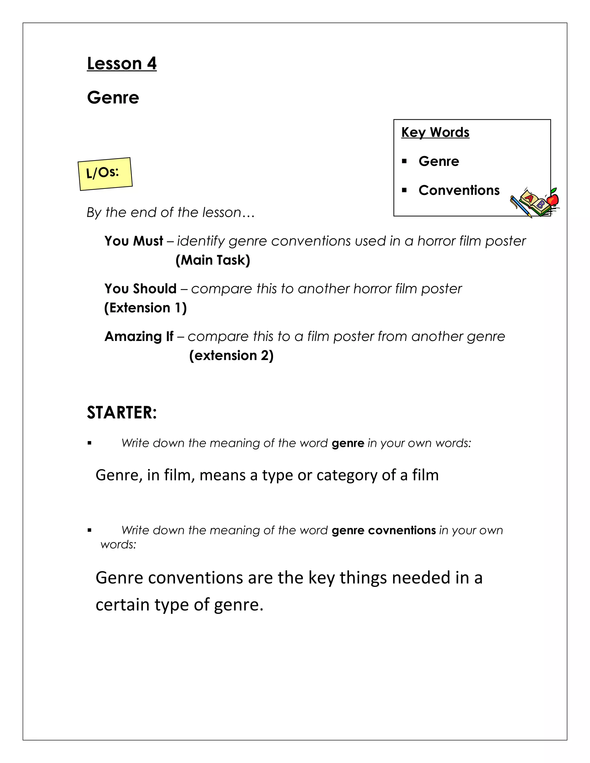 This lesson introduces the concept of genre and genre conventions. Students are tasked with identifying conventions used in horror film posters, comparing conventions between two horror posters, and comparing conventions between a horror and non-horror poster. The lesson concludes with a self-assessment of effort and areas for improvement.