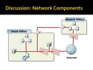 This document discusses various network components such as switches, routers, firewalls, LANs and WANs. It defines each component and their purposes. It also discusses branch offices, their challenges for communication, and how a perimeter network provides security and remote access allows access to network resources from outside the office.