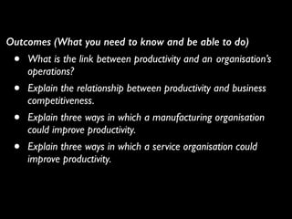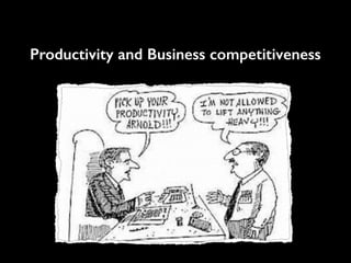 This document discusses the relationship between productivity and business competitiveness. It defines productivity as a measure of efficiency or the amount of output produced compared to the amount of input required. The document explains that productivity can be improved by either producing more outputs from the same inputs through better use of resources, or by reducing inputs needed for the same level of outputs through waste elimination or technology upgrades. It also notes that improvements can be made in facilities, materials management, quality control, and technology. Competitiveness refers to being as good or better than rivals based on factors like cost, quality, and delivery speed.