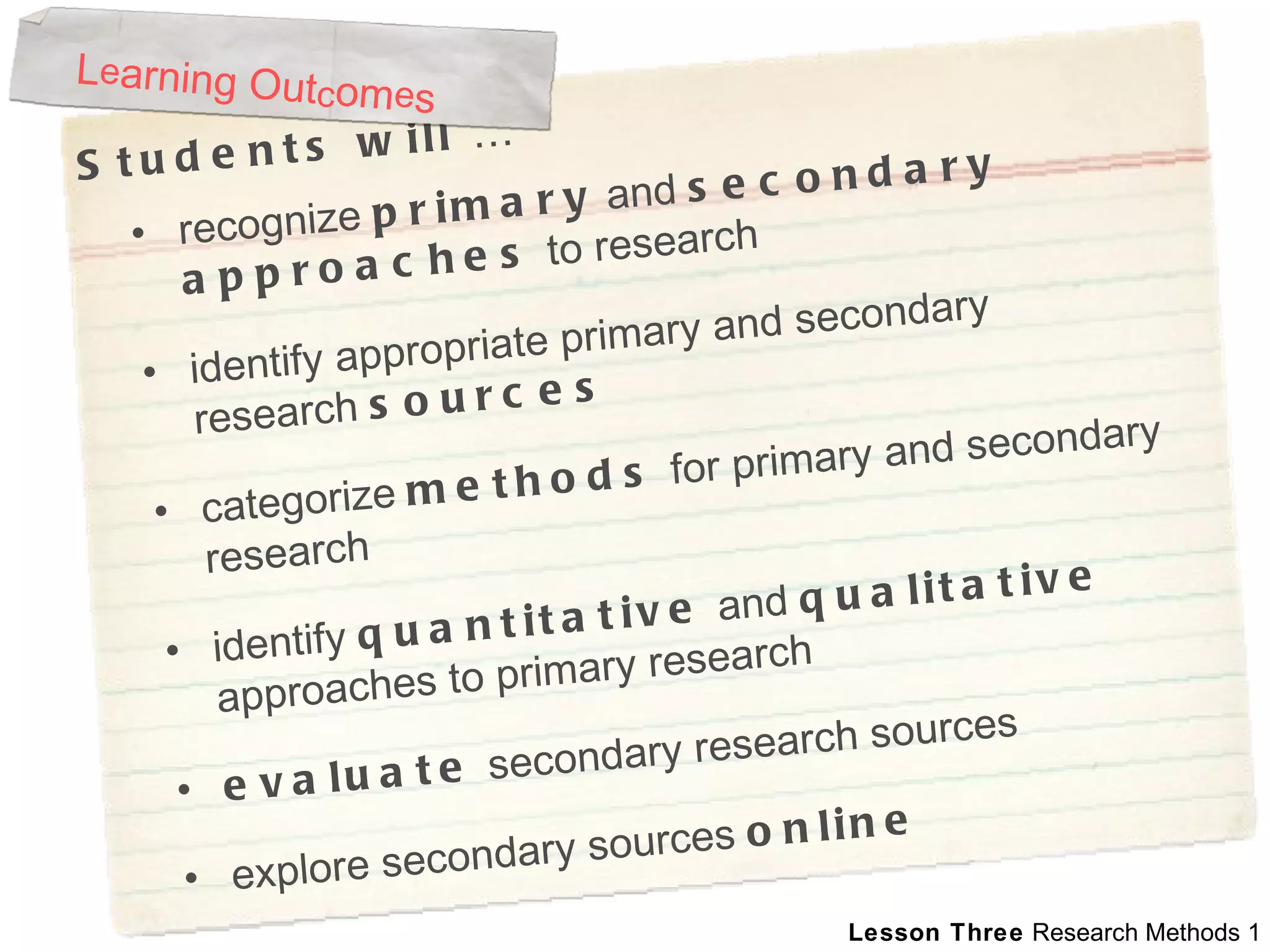This document outlines a lesson plan on research methods. It discusses the key differences between primary and secondary research approaches and sources. It also distinguishes between quantitative and qualitative research methods. The document provides guidance on evaluating secondary sources and discusses appropriate uses of internet sources for research. It provides examples of exercises for students to apply their learning, involving conducting research to address topics related to fashion, marketing, design, and architecture.