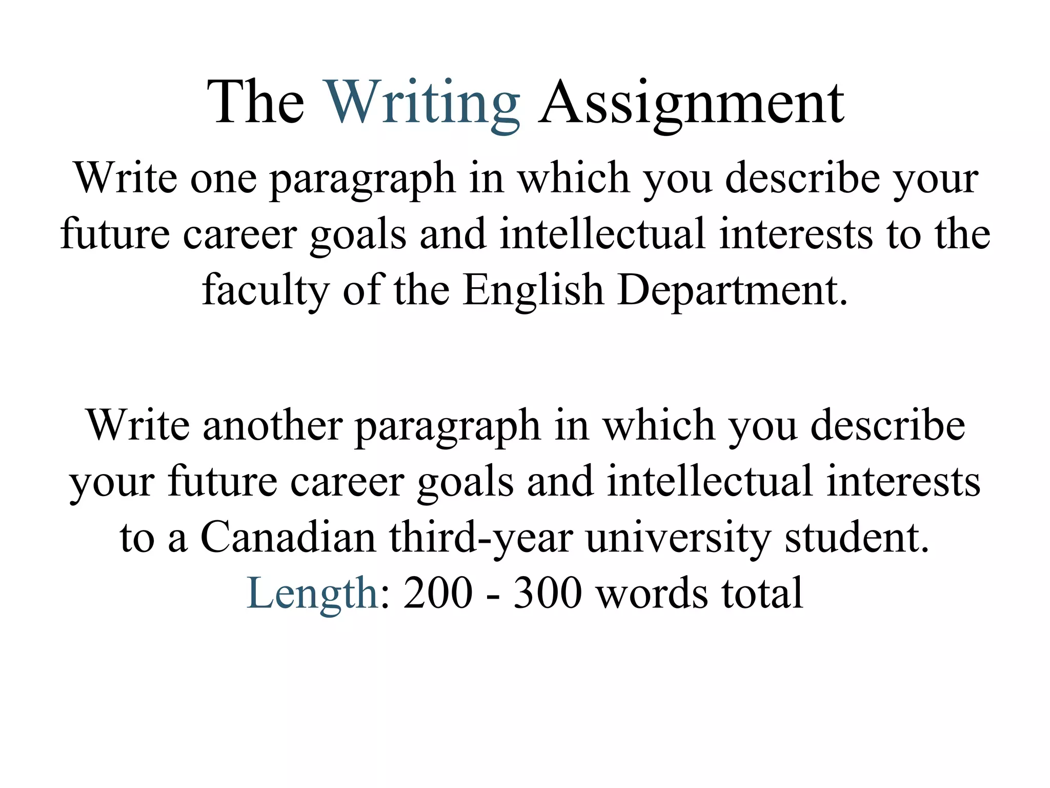 The document provides instructions for a writing assignment. Students are asked to write two paragraphs: one describing their future career goals and interests to the English department faculty, and another to a Canadian university student. They are advised to write between 200-300 words total and experiment with complex sentences. The document then reviews sentence structure, including sentence bases, expansion through coordination, subordination and participial/absolute phrases. It provides examples and exercises for students to practice sentence combining.